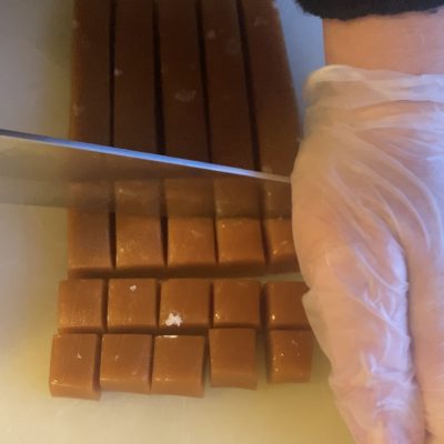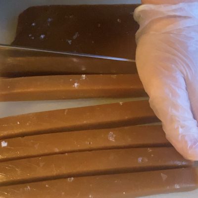 Hvis du ikke har termometer, kan du ta den såkalte dråpetesten. Da fyller du et glass med kaldt vann, og har noen dråper av den varme karamellmassen oppi glasset. Hvis karamellen blandes ut med vannet må den koke lenger. Karamellmassen har kokt lenge nok, når karamellen stivner til en klump i vannet og får samme konsistens som smørbukk. |