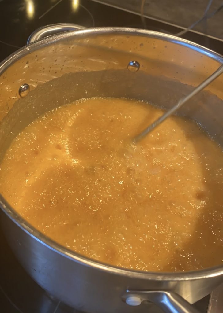 Rør innimellom og la det koke helt til massen er 125 grader. Bruk et sukkertermometer eller et vanlig steketermometer. Jeg anbefaler et digitalt steketermometer som du får kjøpt på feks. Clas Ohlson. VIKTIG: Rør godt rundt når du måler temperaturen, og pass på at du ikke måler temperaturen i bunnen av kjelen, der temperaturen er mye høyere. |