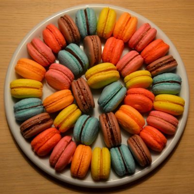 Dette er grunnoppskrift på selve makronene, du velger selv hva slags fyll du vil ha inni. Siden makroner er ganske søte, er det lurt å fylle de med friske kremer med for eksempel sitron, appelsin, bringebær eller pasjonsfrukt, men det passer også med forskjellige sjokolade- og karamellkremer. Jeg vil legge ut oppskrifter på makronfyll etterhvert her på bloggen 🙂